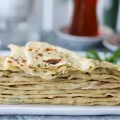 Carne fininha sobre pão-pita, coberta por molho de tomate, manteiga borbulhante e iogurte cremoso.